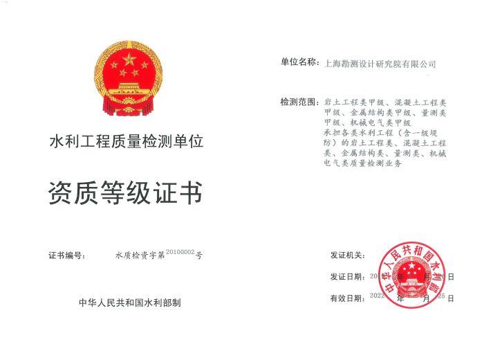 水利工程質量檢測單位:巖土工程甲級、混凝土工程甲級、金屬結構甲級、量測甲級、機械電氣甲級